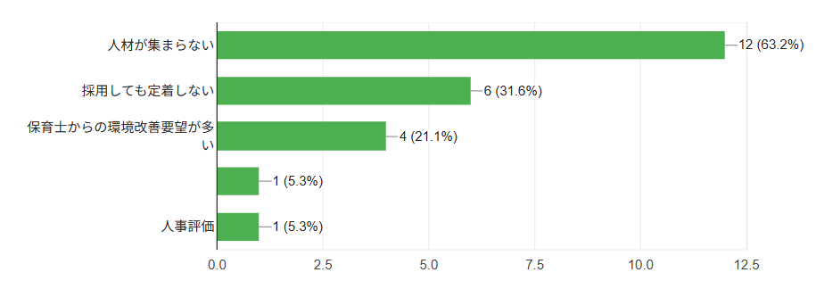 「採用できない」だけでなく「続かない」ことへの悩みが重なっていると考えられます。また、条件面だけでは説明しきれない、職場環境・日常の在り方が背景にあると言えます。これらは以下の回答にもある「園のPRや見せ方」とも密接に関りがあると考えます。